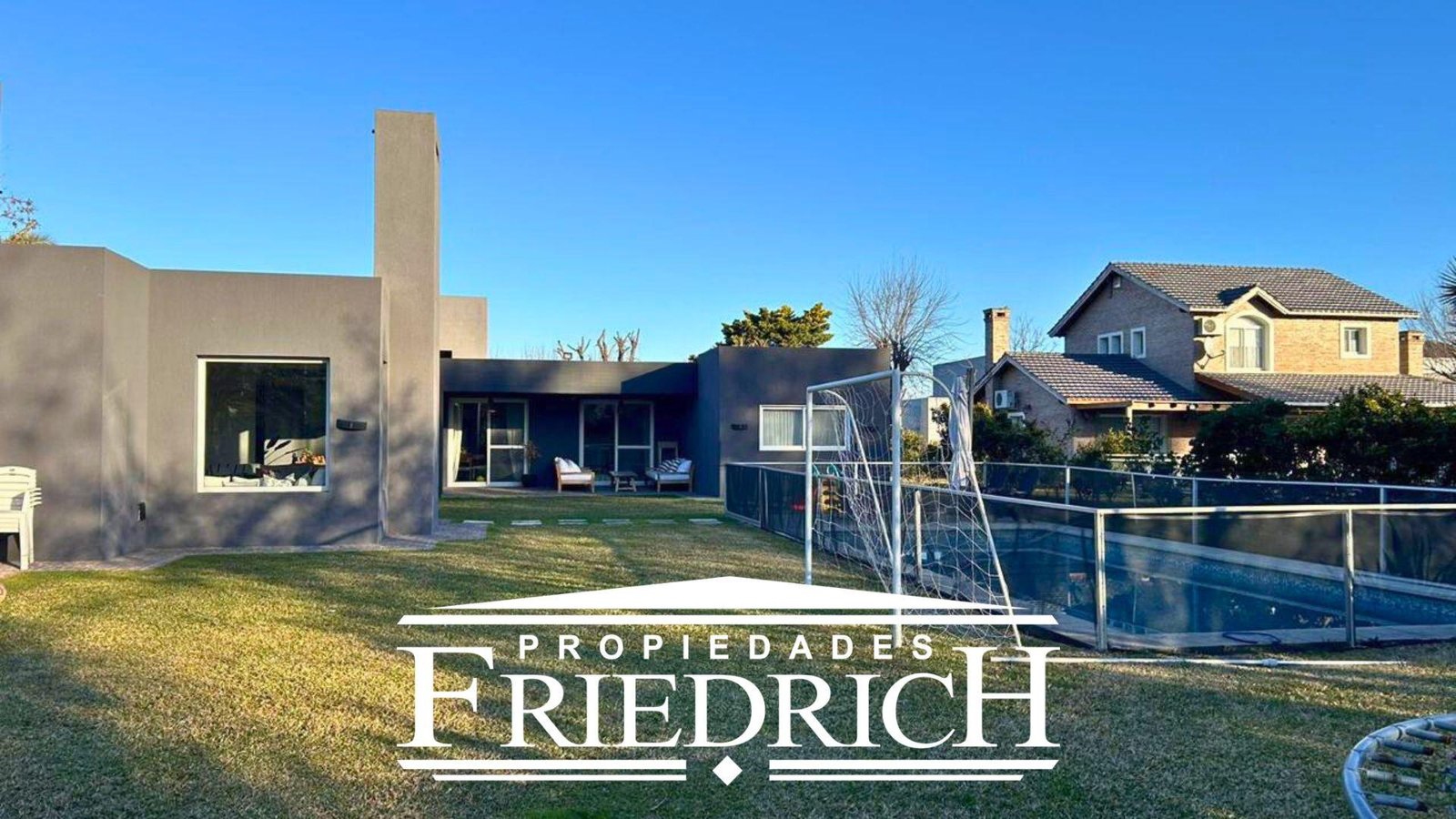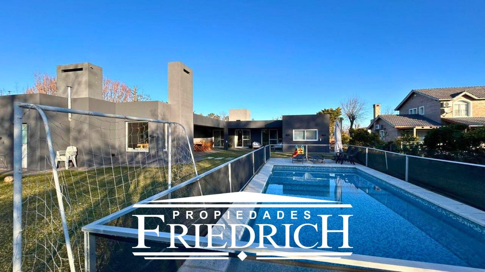 En el exterior, se destaca una galería en L con vistas abiertas al parque, piscina de 8 x 3,5 metros, jardín completamente parquizado y cochera con capacidad para dos vehículos.
